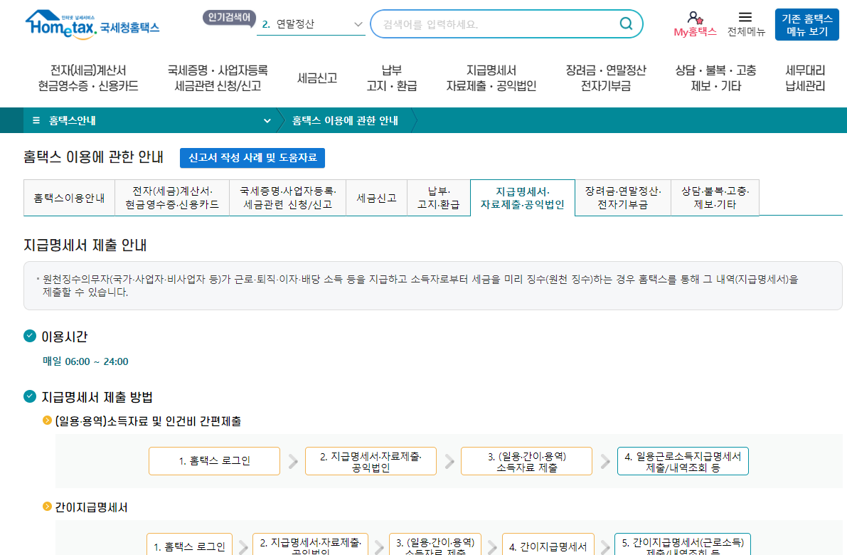 1) 연말정산: 연말정산 대상 소득을 지급한 경우, 다음 연도 2월 15일까지 제출