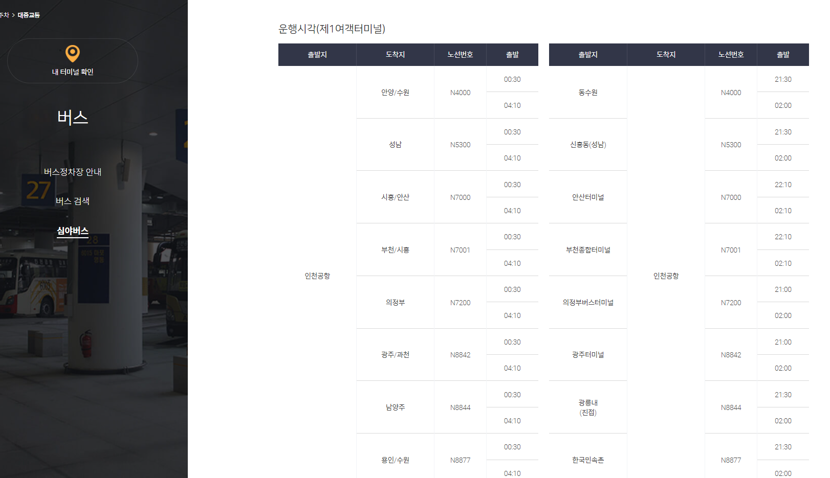 터미널 별 승차 위치까지 자세히 안내되어 있고, 버스 노선 모두 체크하실 수 있으니 확인해 보세요.