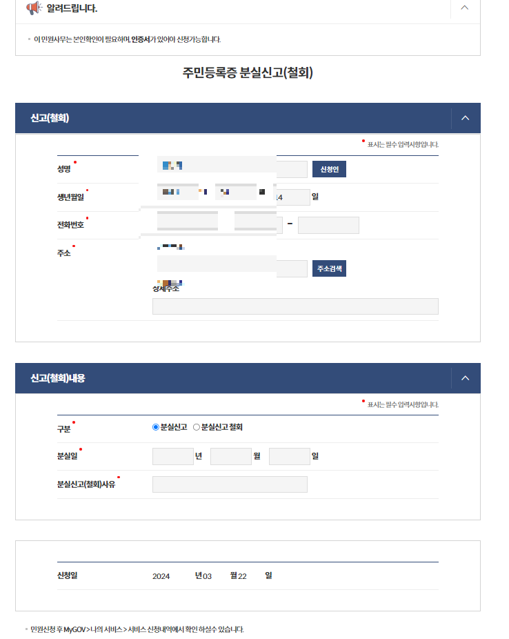 주민등록증분실신고(철회) | 민원안내 및 신청 | 정부24