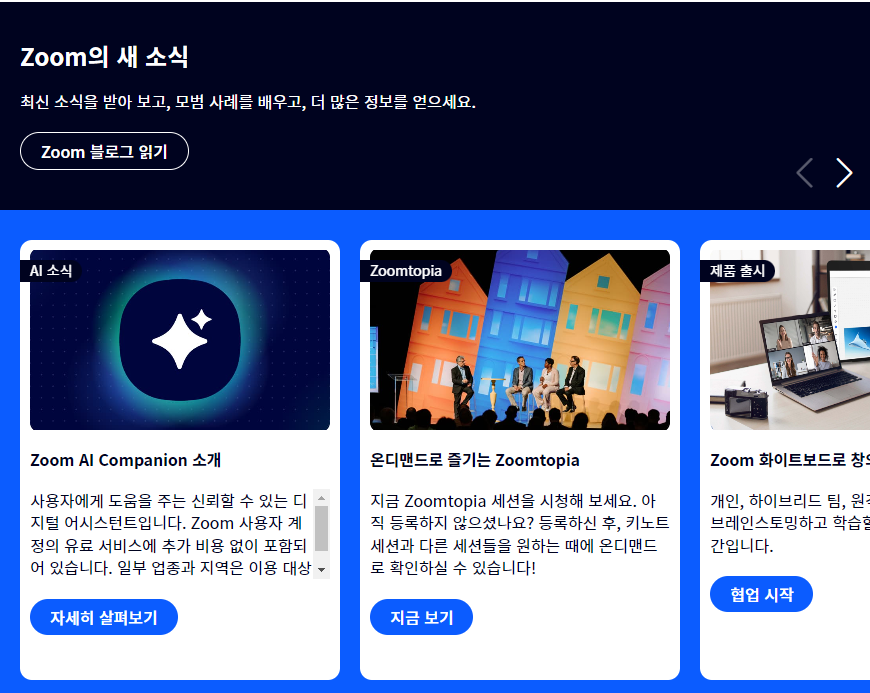 - 가입: 대한민국 Zoom 웹 사이트에 방문하여 계정을 등록하세요. 요구 사항에 따라 다양한 구독 계획 중 선택할 수 있습니다.
