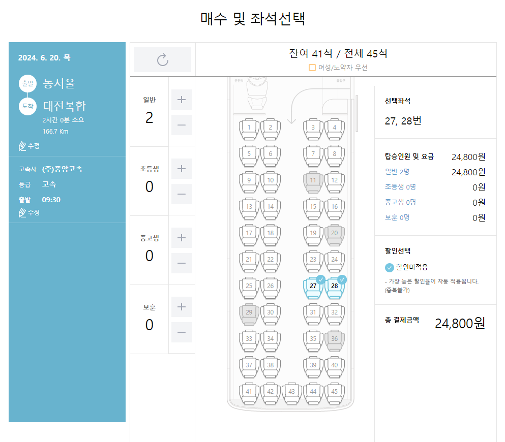 차량을 선택하셨다면, 예매 희망 매수 선택하시고 좌석 지정해주시면 끝입니다.