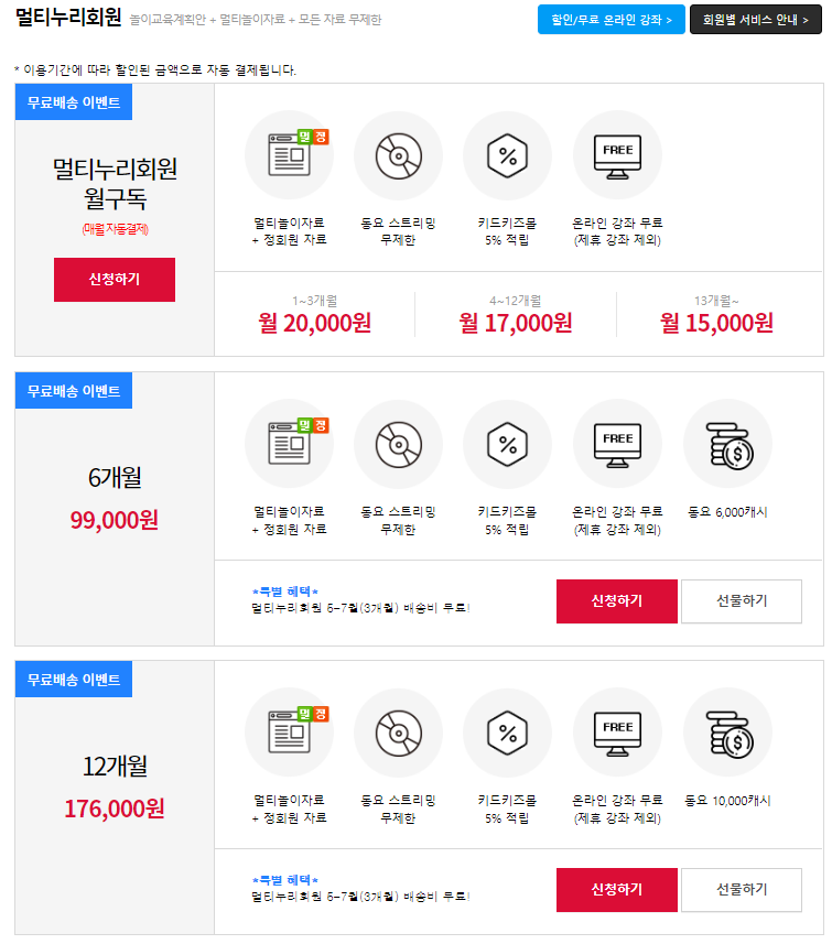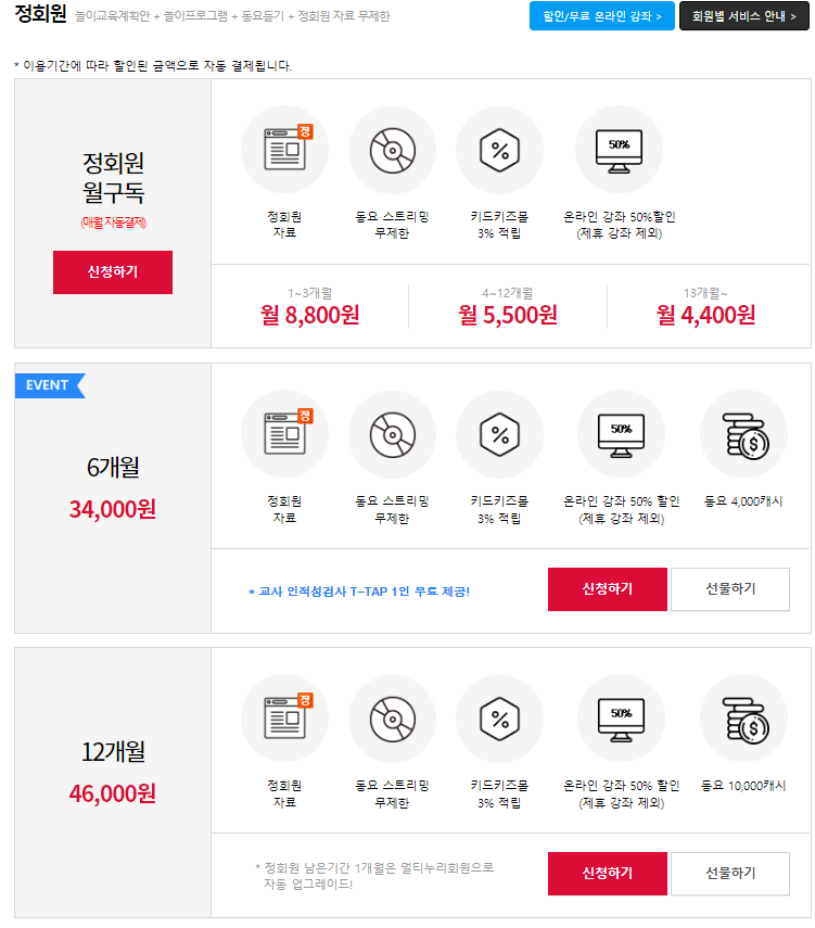 추천 멤버십 정회원12개월 46,000원 정회원자료 동요 스트리밍무제한 키드키즈몰3% 적립 온라인 강좌 50% 할인(제휴 강좌 제외) 동요 10,000캐시 신청하기 선물하기 * 정회원 남은기간 1개월은 멀티누