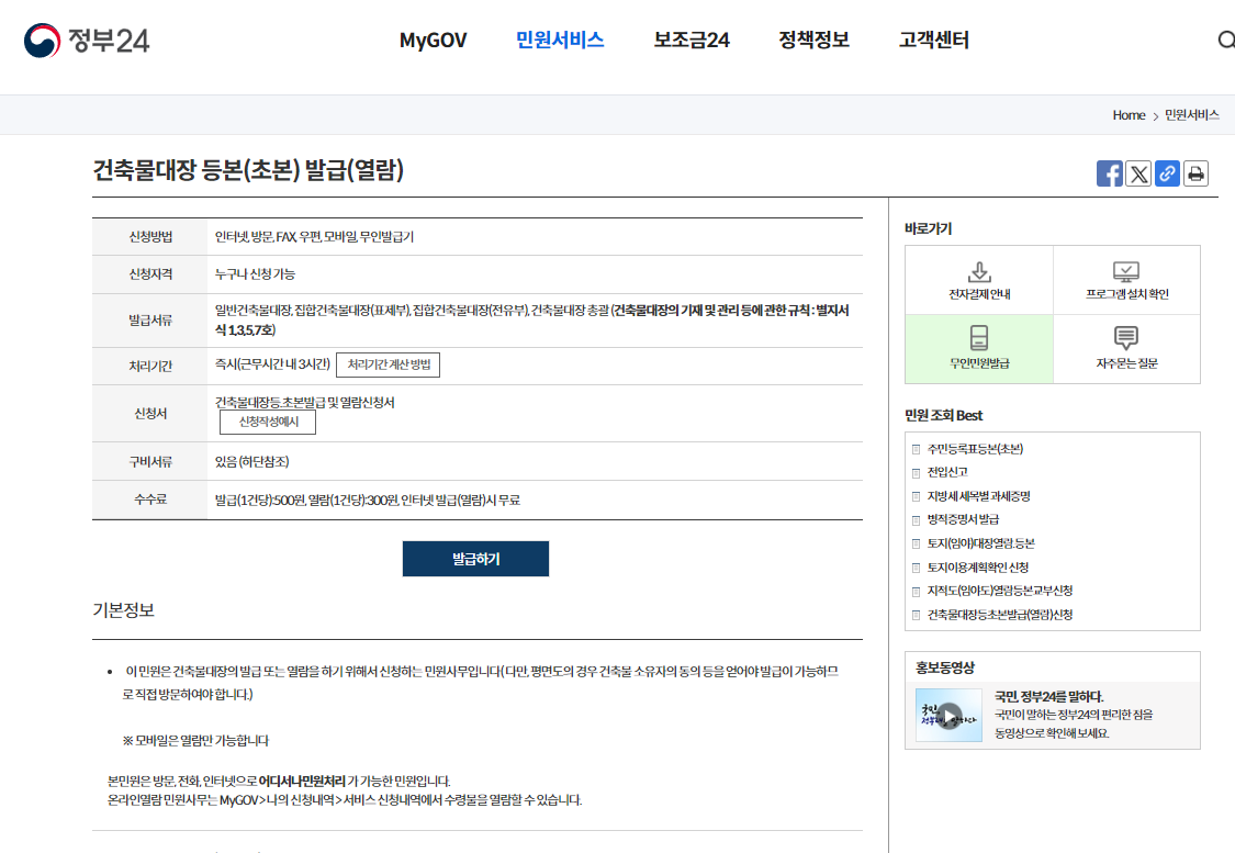 ※ 본인 소유자의 토지를 전자민원(인터넷)으로 등본발급·열람신청시 무료입니다.