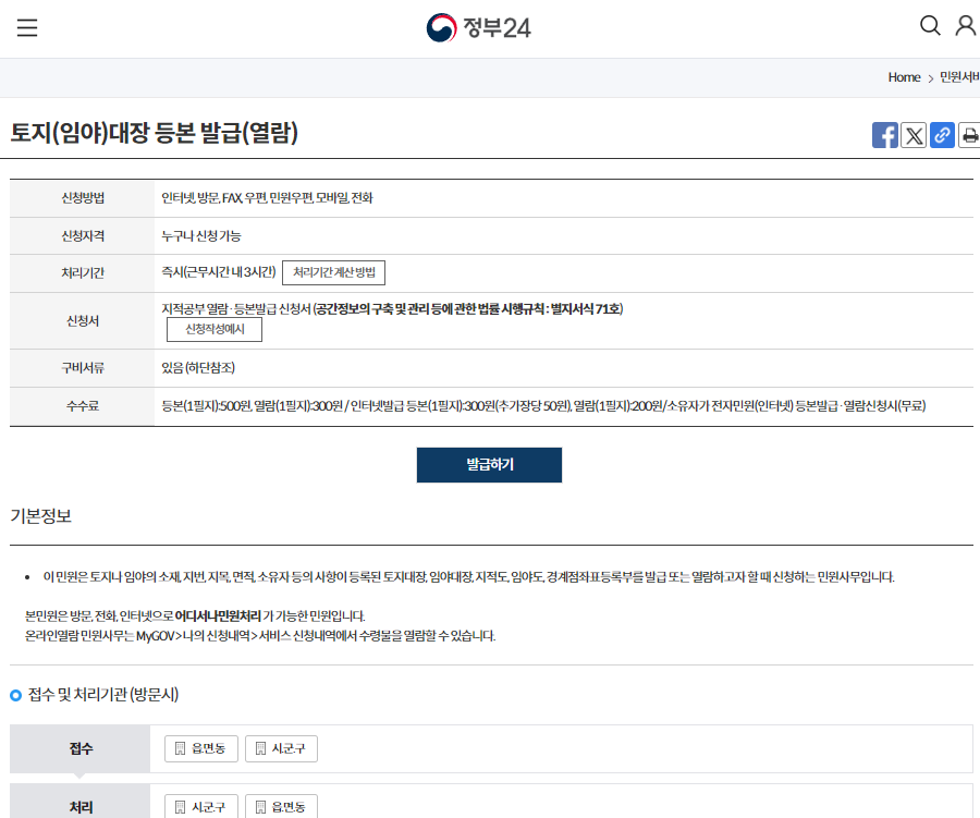 토지대장 수수료가 각각 상이합니다