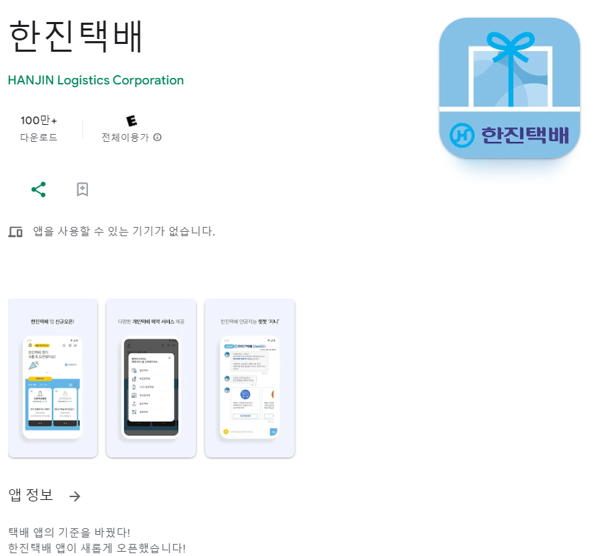 1) 스마트폰에 한진택배 모바일 앱을 설치합니다.